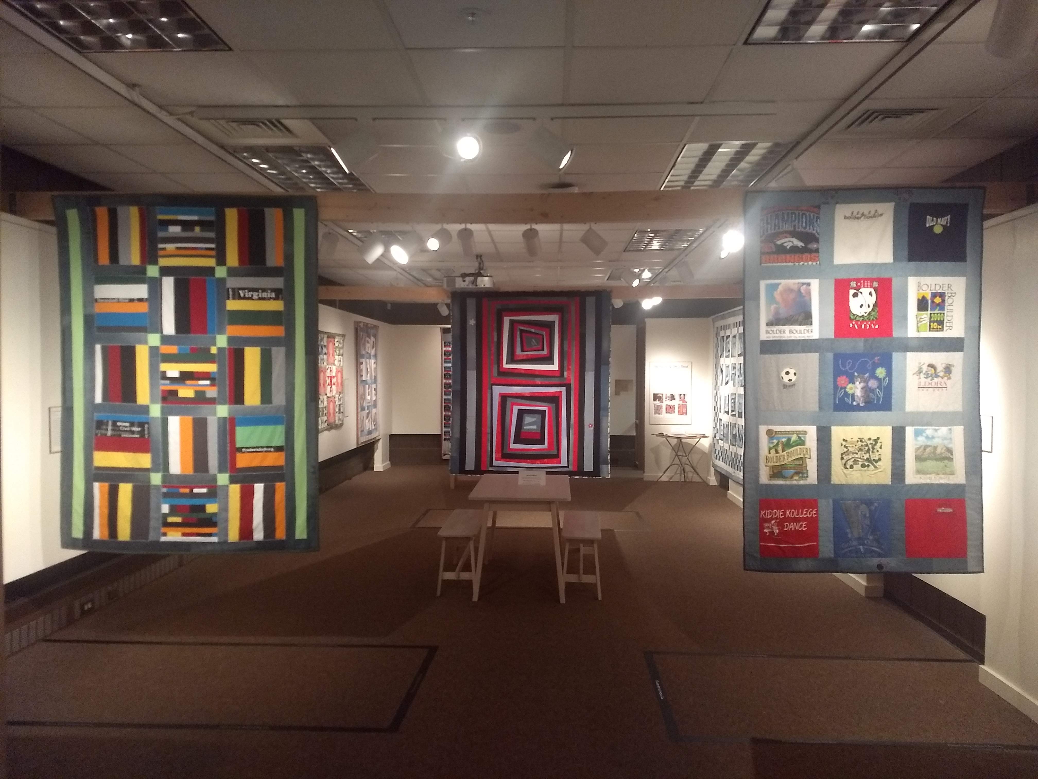 This exhibit featured quilts made by Frédérique Chevillot, a French and Francophone Studies professor. Each quilt is an expression of a feeling, a person, or a story that is carefully sewn in fabric. As a quilt maker, Sister Fred has the power to give new life to the materials through reuse. The clothing worn by loved ones becomes a sort of second skin when sewn into a quilt.